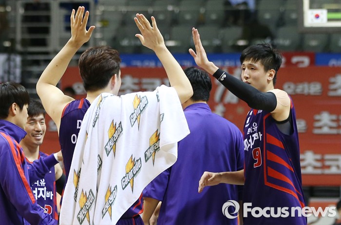 (고양=포커스뉴스) 26일 고양체육관에서 열린 2015-2016 프로농구 오리온-동부 6강 플레이오프 1차전에서 동부를 물리친 오리온 이승현과 최진수가 하이파이브를 하며 기뻐하고 있다.