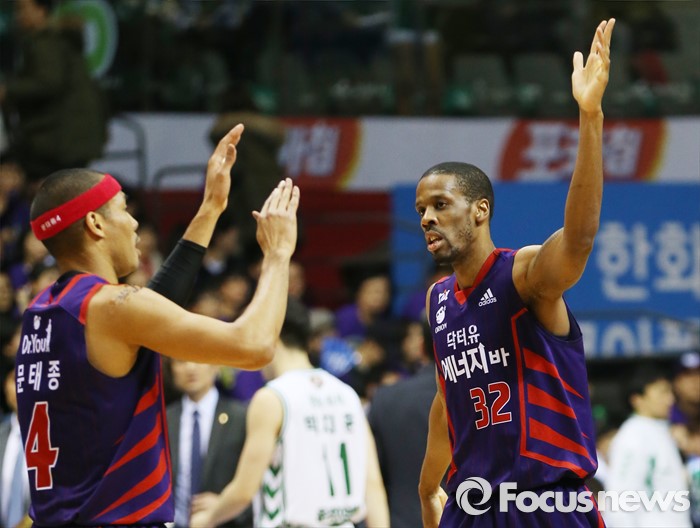 (고양=포커스뉴스) 28일 고양체육관에서 열린 2015-2016 프로농구 오리온-동부 6강 플레이오프 2차전에서 오리온 헤인즈가 3점슛을 성공시킨 문태종과 하이파이브를 하고 있다.