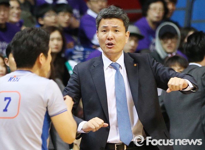 (고양=포커스뉴스) 28일 고양체육관에서 열린 2015-2016 프로농구 오리온-동부 6강 플레이오프 2차전에서 동부 김영만 감독이 심판에게 판정에 대해 항의하고 있다.