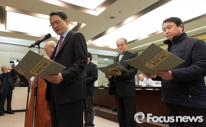 (서울=포커스뉴스) 29일 오후 서울 중구 프레스센터에서 '3.1 운동의 정신을 이어 민족의 평화와 화해, 신뢰회복을 위한 종교인 기자회견'에 참석한 전병금(왼쪽) 목사가 성명서를 낭독하고 있다.
