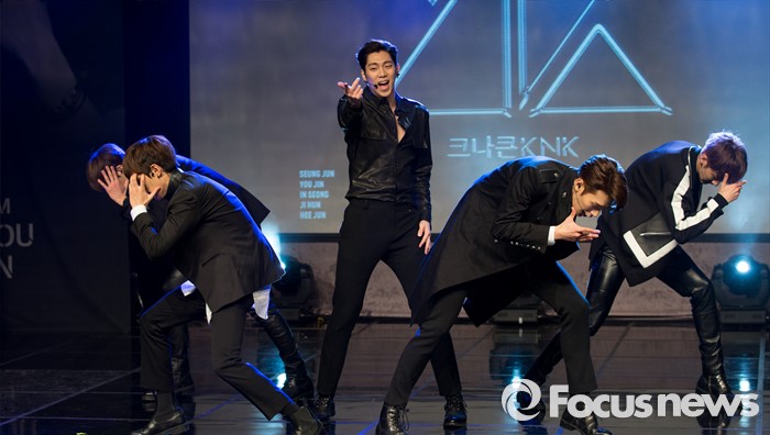 (서울=포커스뉴스) 29일 오후 서울 강남구 일지아트홀에서 신인 보이그룹 크나큰이 데뷔 쇼케이스에서 타이틀곡 'KNOCK'를 선보이고 있다.