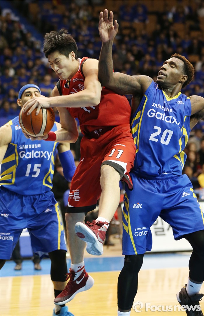 (서울=포커스뉴스) 2일 서울 잠실실내체육관에서 열린 2015-2016 프로농구 삼성-KGC 6강플레이오프 4차전에서 KGC 양희종이 삼성 라틀리프에 앞서 리바운드볼을 잡아내고 있다.