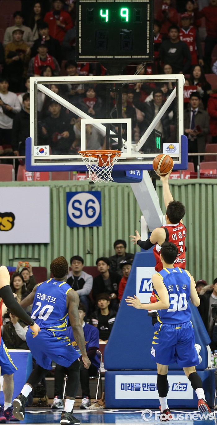 (서울=포커스뉴스) 2일 서울 잠실실내체육관에서 열린 2015-2016 프로농구 삼성-KGC 6강플레이오프 4차전에서 KGC 이정현이 4초를 남기고 83-83 동점 상황에서 승리를 결정짓는 레이업슛을 성공시키고 있다.