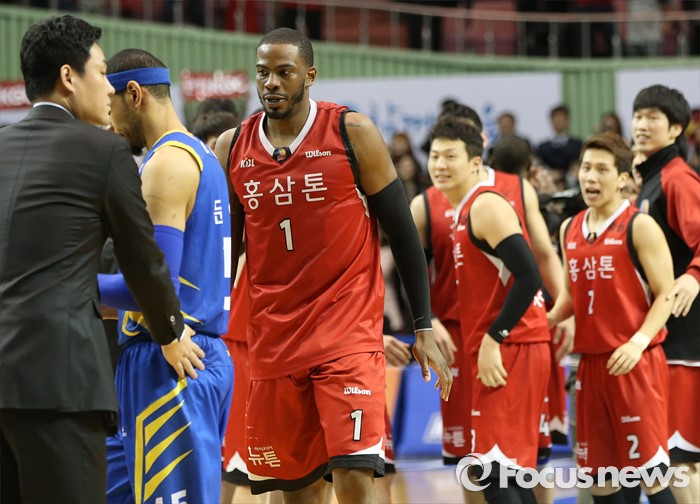 (서울=포커스뉴스) 2일 서울 잠실실내체육관에서 열린 2015-2016 프로농구 삼성-KGC 6강플레이오프 4차전에서 경기를 마친후 KGC 찰스 로드가 삼성 문태영에게 다가가고 있다.