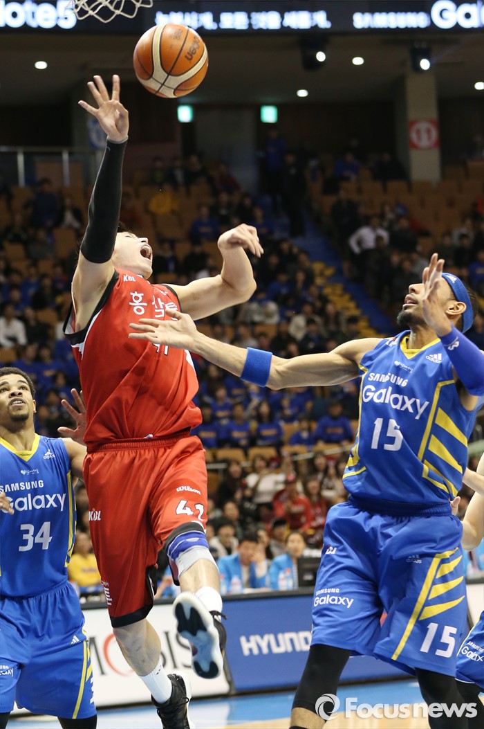 (서울=포커스뉴스) 2일 서울 잠실실내체육관에서 열린 2015-2016 프로농구 삼성-KGC 6강플레이오프 4차전에서 KGC 오세근이 삼성 문태영의 수비에 걸려 볼을 놓치고 있다.