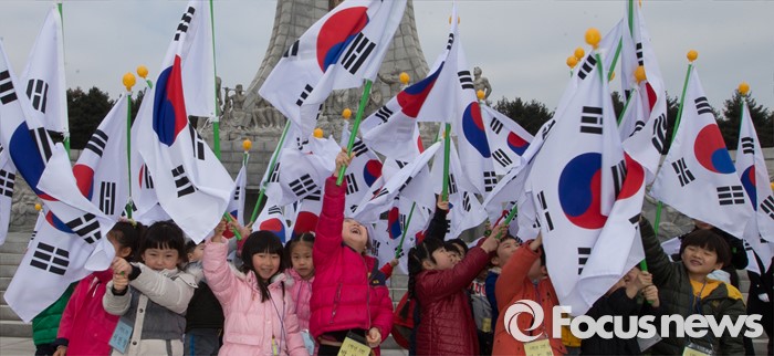 (대전=포커스뉴스) 3일 오전 입학 후 첫 수업에 들어간 대전 화정초등학교 1학년 신입생들이 대전 유성구 국립대전현충원을 찾아 참배를 마치고 태극기를 흔들고 있다.