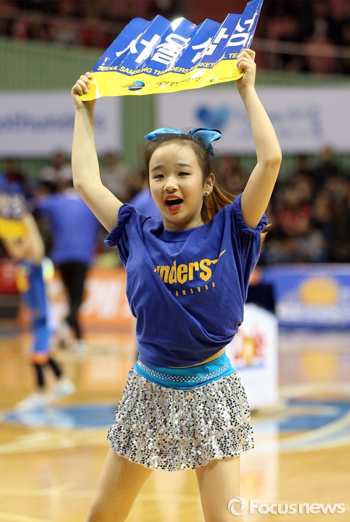 (서울=포커스뉴스) 2일 서울 잠실실내체육관에서 열린 2015-2016 프로농구 삼성-KGC 6강플레이오프 4차전 하프타임매 리틀썬더스의 꼬마 숙녀가 앙징맞은 응원을 펼치고 있다.