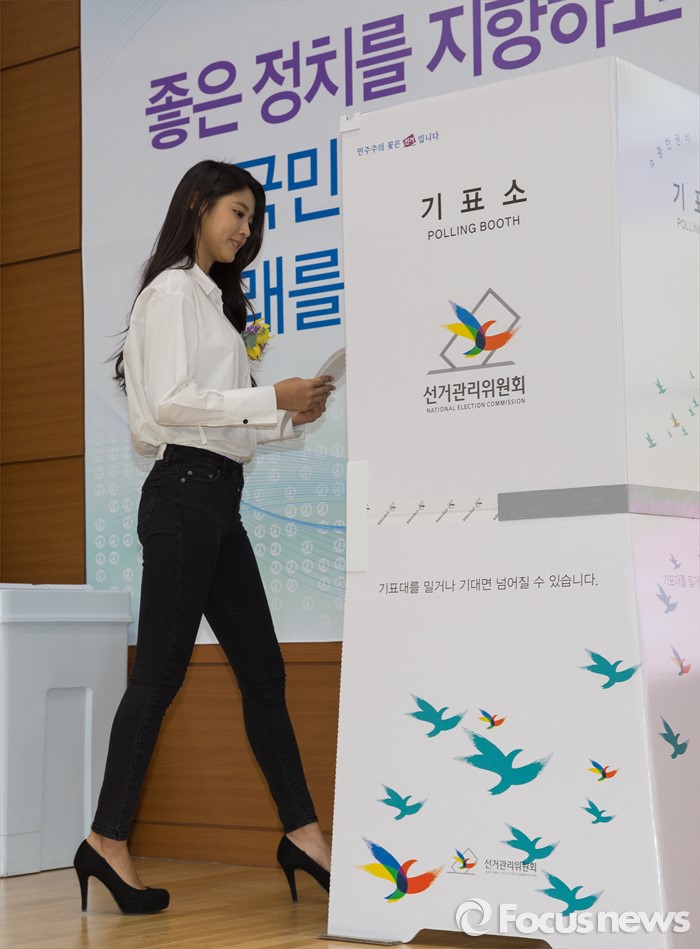 (과천=포커스뉴스) 3일 오후 경기도 과천시 중앙선거관리위원회에서 열린 '아름다운 선거 홍보대사 위촉식'에서 그룹 AOA의 가수 설현이 제20대 국회의원선거상황실에 마련된 모의 사전투표를 체험하고 있다.