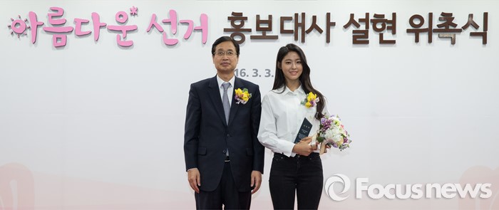 (과천=포커스뉴스) 3일 오후 경기도 과천시 중앙선거관리위원회에서 열린 '아름다운 선거 홍보대사 위촉식'에서 김용희 사무총장이 그룹AOA의 가수 설현과 기념촬영을 하고 있다.