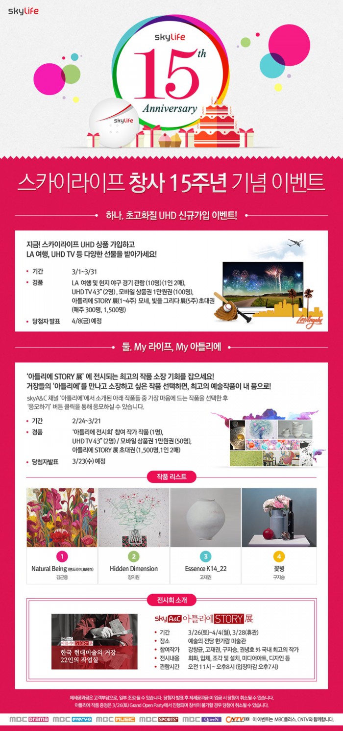 지난달 24일 시작한 이벤트 ‘마이 라이프, 마이 아틀리에’는 국내 현대 미술의 거장 22인의 작품 200여 점을 직접 만나볼 수 있는 ‘스카이 A&C 아틀리에 스토리 전‘ 초대권을 증정한다. 김근중, 장지원, 고재권, 구자승 등 네 명의 작가가 그린 명화 각 한 점씩도 경품 후보작으로 내놓는다. 이달 21일까지 스카이라이프 인터넷 홈페이지 (www.skylife.co.kr)에 접속해 4개 후보작 가운데 1개를 고르면 추첨을 통해 한 명에게 선택한 작품이 증정된다.