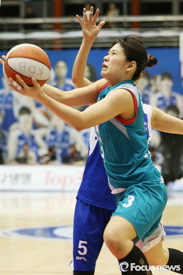 (구리=포커스뉴스) 3일 구리시체육관에서 열린 2015~2016 여자프로농구 KDB생명- KEB하나 경기에서 KEB하나 서수빈이 KDB생명 이경은의 마크를 뚫고 레이업슛을 시도하고 있다.