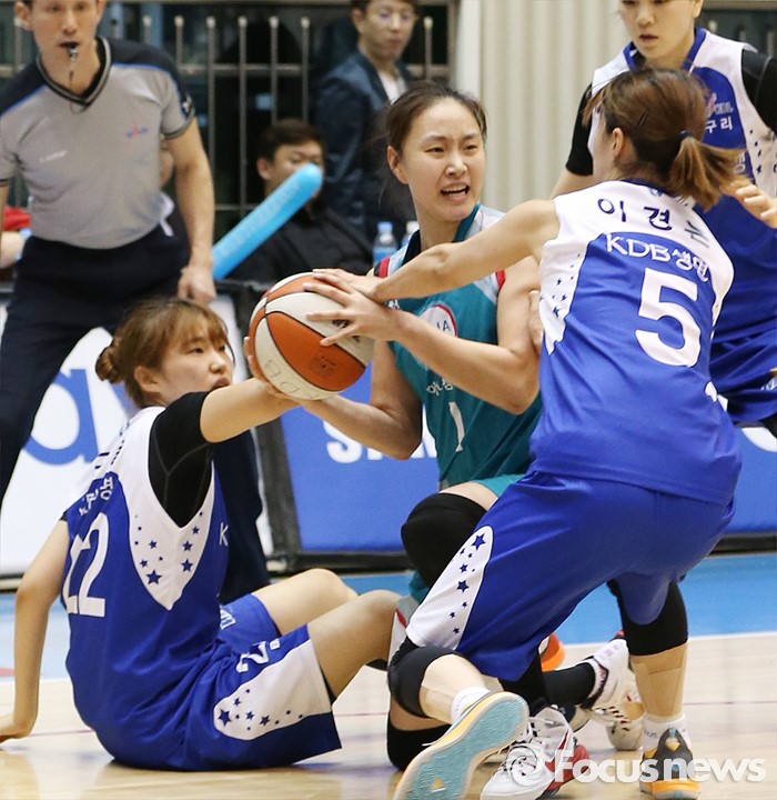 (구리=포커스뉴스) 3일 구리시체육관에서 열린 2015~2016 여자프로농구 KDB생명- KEB하나 경기에서 KEB하나 염윤아와 KDB생명 이경은이 서로 볼을 차지하기 위해 안간힘을 쓰고 있다.