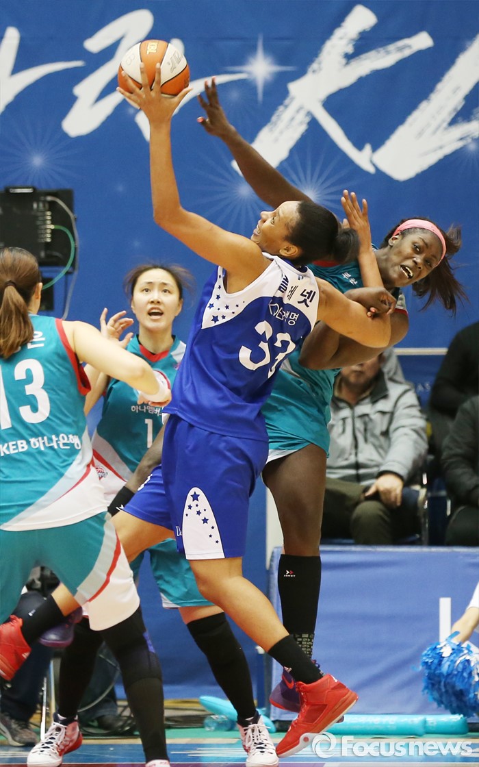 (구리=포커스뉴스) 3일 구리시체육관에서 열린 2015~2016 여자프로농구 KDB생명- KEB하나 경기에서 KDB생명 플레넷이 KEB하나 모스비에 앞서 리바운드볼을 잡아내고 있다.