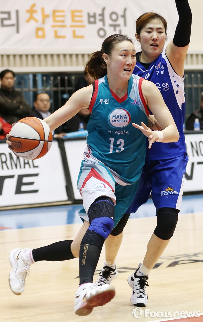(구리=포커스뉴스) 3일 구리시체육관에서 열린 2015~2016 여자프로농구 KDB생명- KEB하나 경기에서 KEB하나 김정은이 KDB생명 노현지를 제치며 골밑으로 대시하고 있다.