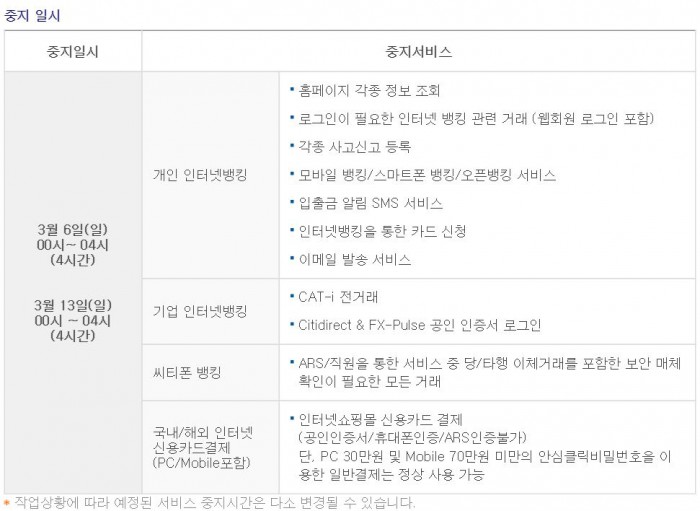 중단되는 서비스는 ▲개인 인터넷뱅킹(각종 조회, 거래, 사고신고 등록, 모바일뱅킹 서비스 등) ▲기업 인터넷뱅킹(CAT-i거래 등) ▲씨티폰 뱅킹 ▲국내 및 해외 인터넷 신용카드결제 등이다.