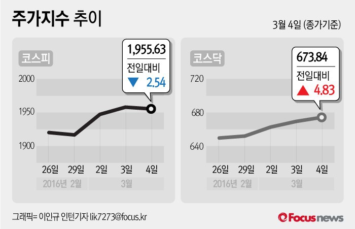 (서울=포커스뉴스) 4일 코스피지수는 전날 보다 0.13%(2.54포인트) 내린 1955.63에 장을 마쳤다. 코스닥지수는 전일 대비 0.72%(4.83포인트) 오른 673.84에 마감했다.