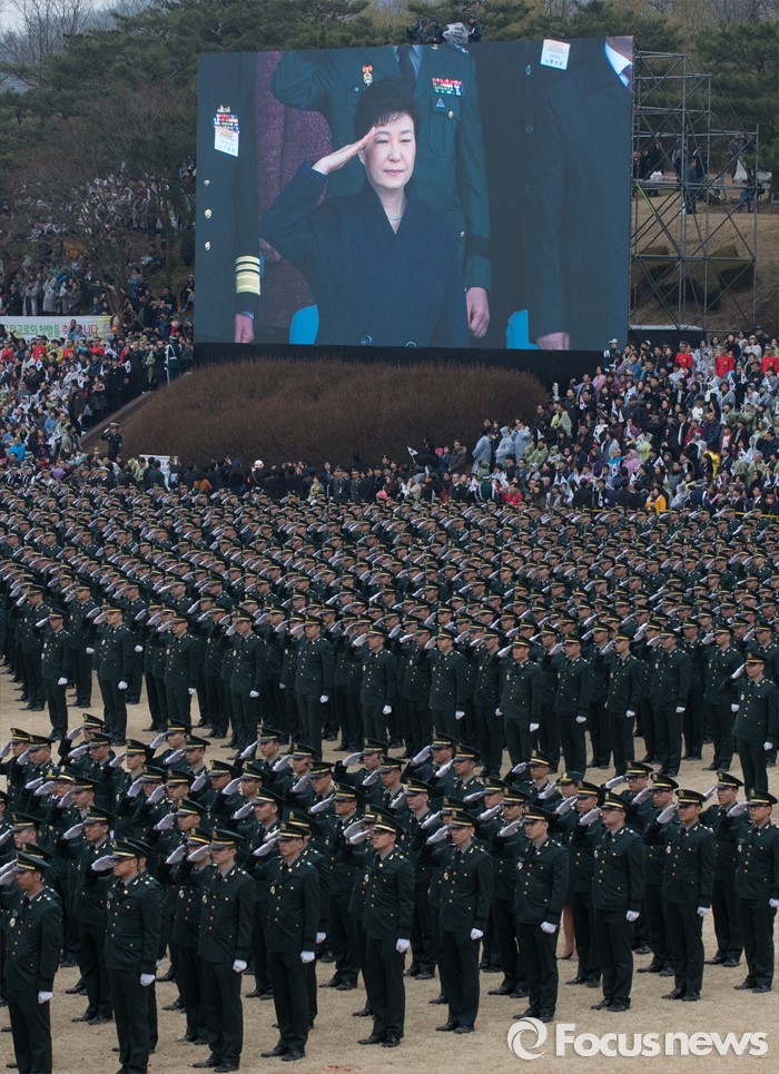 (계룡=포커스뉴스) 4일 오후 충남 계룡대 연병장에서 열린 2016년 장교 합동임관식에서 신임장교들이 박근혜 대통령에게 거수경례를 하고 있다.