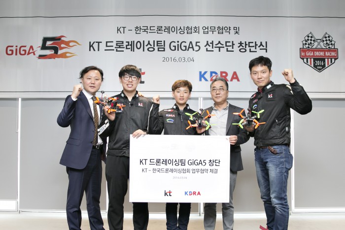 한편 KT는 아직 초기 단계에 있는 국내 드론레이싱 저변 확대와 국제 수준의 대회 개최를 위해 한국드론레이싱협회(협회장 강희동)와 업무협약을 맺었다. 이번 업무협약을 통해 KT는 국내 통신사 중 유일하게 한국드론레이싱협회가 주관하는 드론레이싱 대회의 독점적 후원 권리를 갖게 됐으며, 앞으로 드론의 대중화와 더불어 미래 ICT 스포츠로 자리매김하도록 선도해나갈 계획이다.KT 드론레이싱팀 GiGA5 <사진제공=KT>