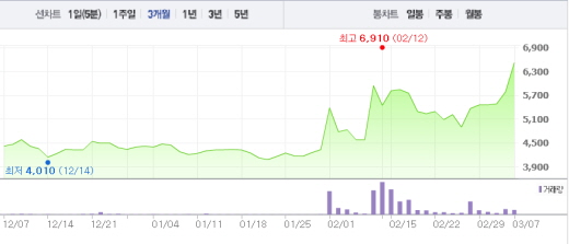 7일 오전 9시21분 오공은 전날보다 12.09%(700원) 오른 6490원에 거래되고 있다.