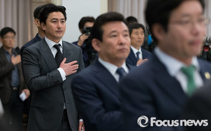 (서울=포커스뉴스) 7일 오전 서울 중구 프레스센터에서 2017 피파 20세 월드컵조직위원회 창립총회에 참석한 안정환 해설위원이 국민의례를 하고 있다.