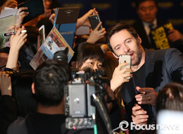 (서울=포커스뉴스) 7일 오후 서울 영등포구 IFC몰 광장에서 열린 영화 '독수리 에디' 레드카펫 행사에 참석한 배우 휴 잭맨이 팬들과 기념 촬영을 하고 있다.