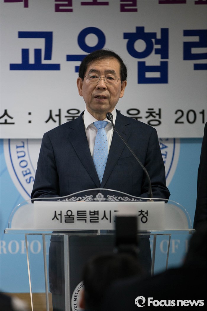 (서울=포커스뉴스) 박원순 서울시장이 8일 오전 종로구 서울시 교육청에서 열린 '서울시-교육청 교육협력사업 기자회견' 참석해 인사말을 하고 있다.