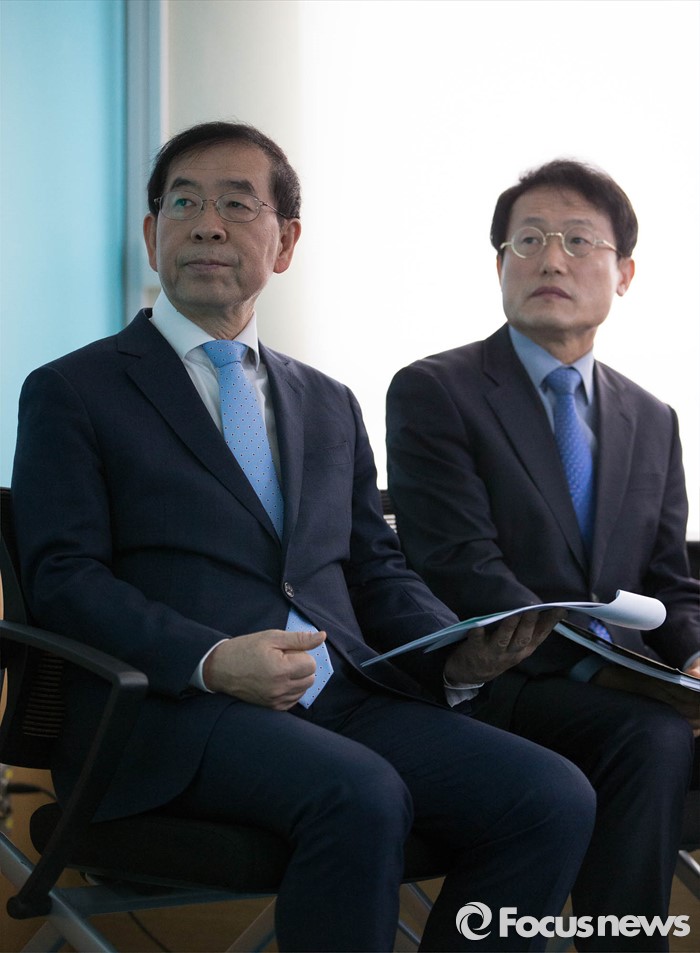 (서울=포커스뉴스) 8일 오전 종로구 서울시 교육청에서 열린 '서울시-교육청 교육협력사업 기자회견' 참석한 박원순(왼쪽) 서울시장과 조희연 서울시교육감이 발표 화면을 보고 있다.