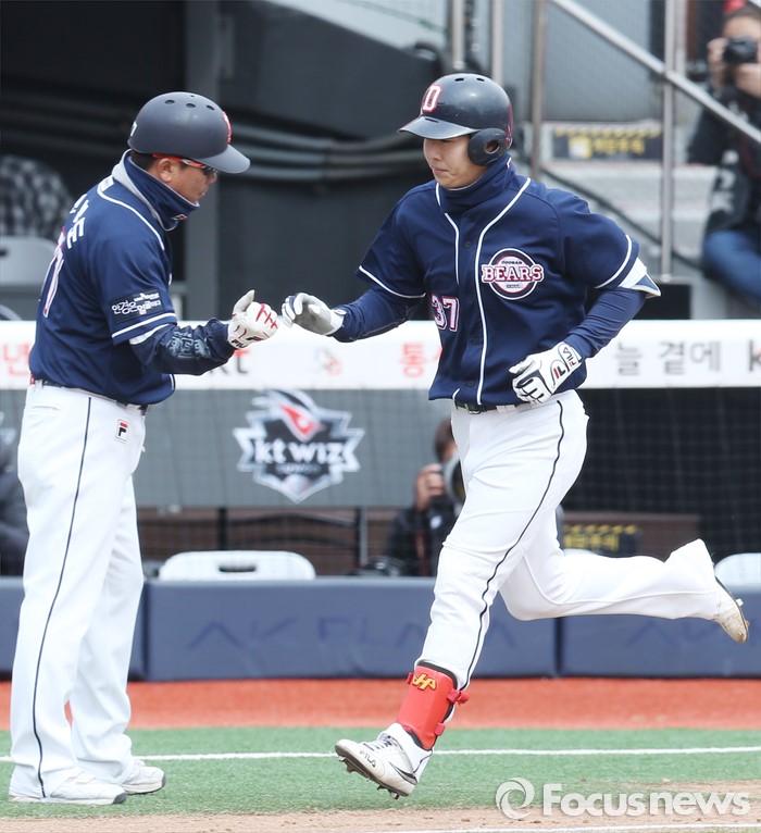 (수원=포커스뉴스) 8일 수원 kt위즈파크에서 열린 2016 KBO리그 시범경기 두산-kt 경기에서 5회초 두산 박건우가 좌월 솔로홈런을 날리고 홈인하며 전형도 3로코치의 환영을 받고 있다.
