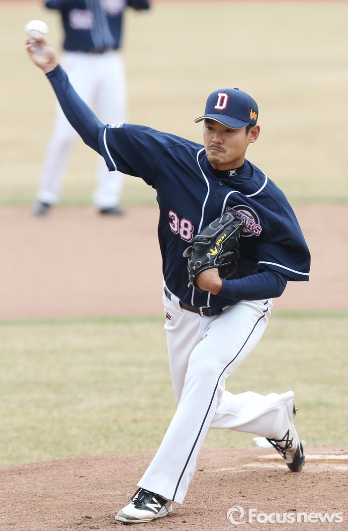 (수원=포커스뉴스) 8일 수원 kt위즈파크에서 열린 2016 KBO리그 시범경기 두산-kt 경기에서 1회말 두산 선발투수 노경은이 힘차게 공을 뿌리고 있다.