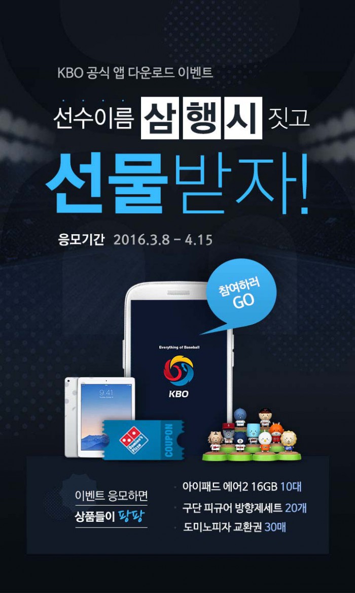 '다운로드 이벤트'는 8일부터 다음달 15일까지 KBO앱을 다운로드한 뒤 자유게시판에 선수 이름으로 삼행시를 남기면 자동 참여된다. 기존 이용자도 참여 가능하다. 추첨을 통해 아이패드 에어2, 구단 캐릭터 피규어 방향제 세트 등 총 60명에게 1000만원 상당의 경품을 준다.