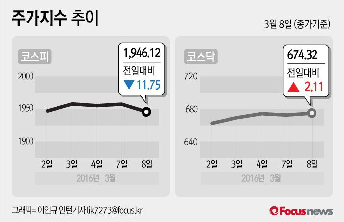 (서울=포커스뉴스) 8일 코스피지수는 전날 보다 0.60%(11.75포인트) 내린 1946.12에 장을 마쳤다. 코스닥지수는 전일 대비 0.31%(2.11포인트) 오른 674.32에 마감했다.