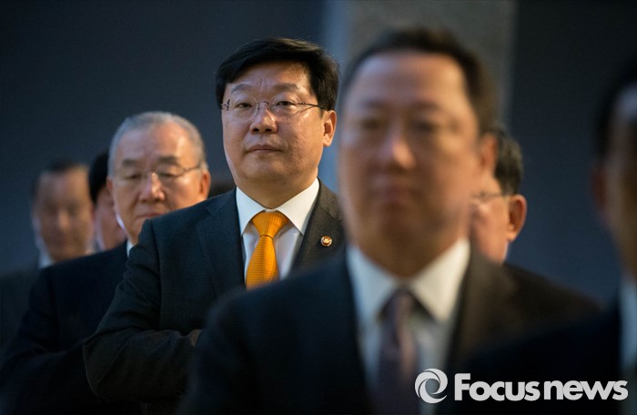 (서울=포커스뉴스) 9일 오전 서울 중구 플라자호텔에서 열린 '2016 경제단체협의회 정기총회'에 참석한 주형환 산업통상자원부 장관이 국민의례를 하고 있다.