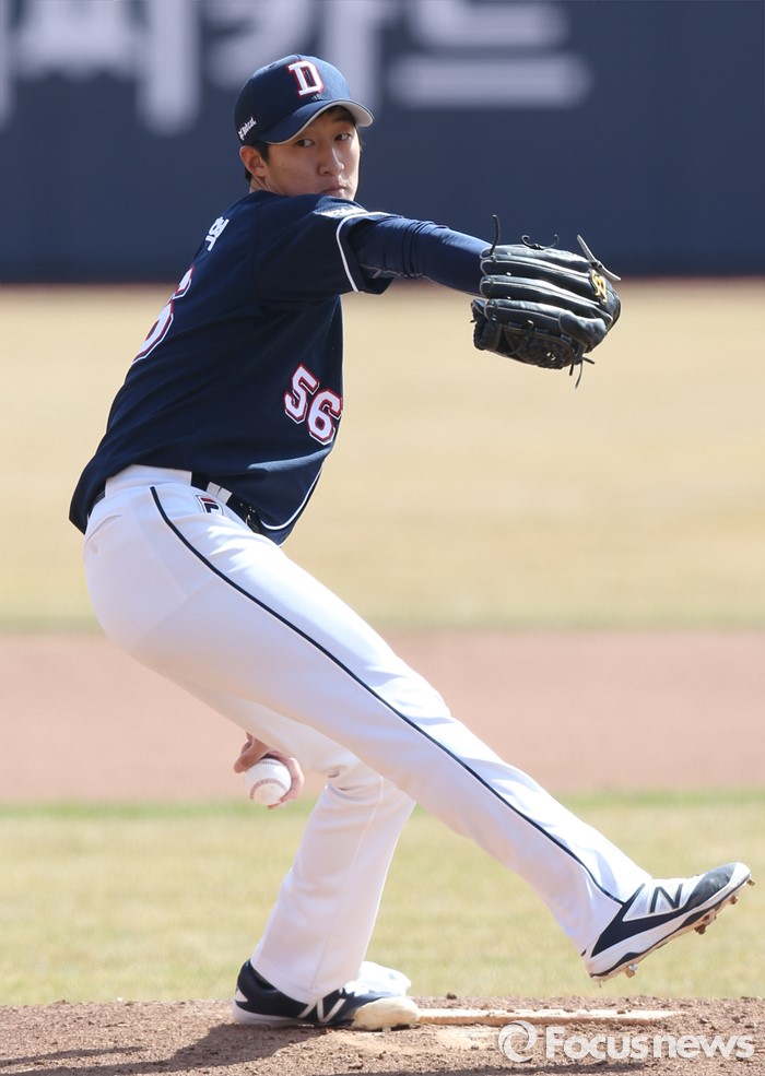 (수원=포커스뉴스) 9일 수원 kt위즈파크에서 열린 2016 KBO리그 시범경기 두산-kt 경기에서 1회말 두산 선발 허준혁이 투구하고 있다