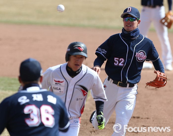 (수원=포커스뉴스) 9일 수원 kt위즈파크에서 열린 2016 KBO리그 시범경기 두산-kt 경기에서 1회말 무사 1,2루에서 kt 1루주자 김민혁이 협살에 걸려 두산 유격수 김재호가 1루로 송구하고 있다.