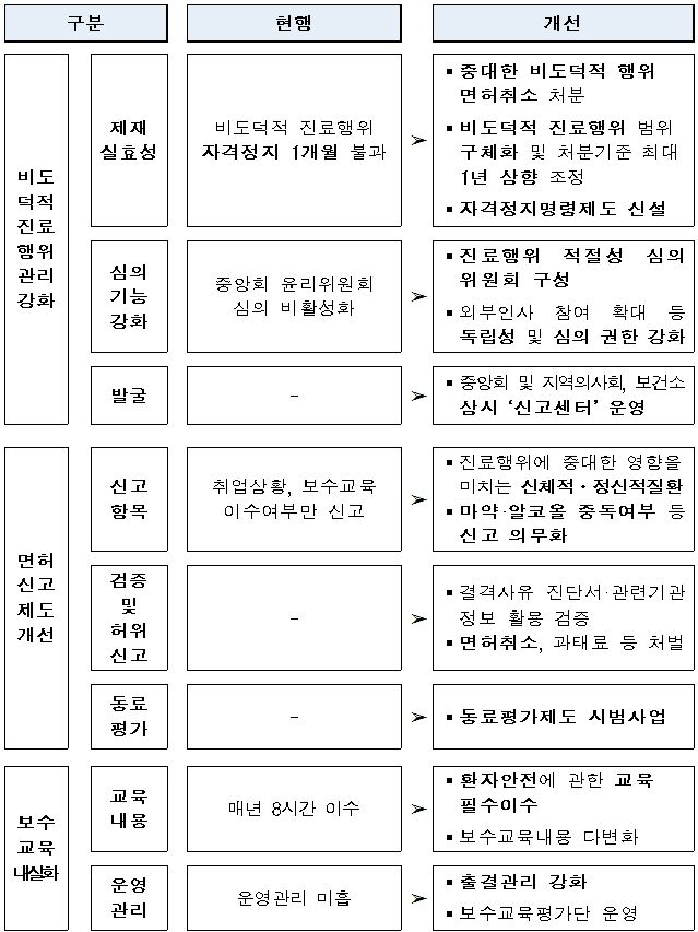 의료인 면허신고 요건도 강화된다. 현재는 의료인 면허신고시 취업상황, 보수교육 이수여부만 신고하면 되지만 앞으로는 뇌손상, 치매 등 진료행위에 중대한 영향을 줄 수 있는 신체적·정신적 질환여부, 마약 또는 알코올 중독여부 등이 항목에 포함된다.