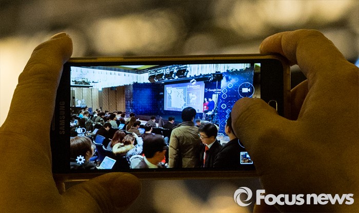 (서울=포커스뉴스) 9일 오후 서울 종로구 포시즌스 호텔에서 열린 이세돌 9단과 알파고의 '구글 딥마인드 챌린지 매치'에서 한 관계자가 기자실을 촬영하고 있다.