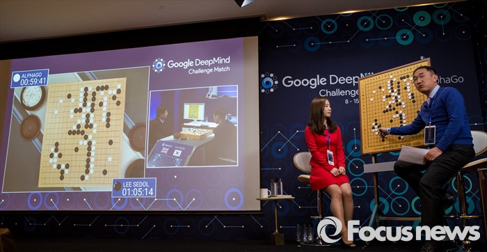 (서울=포커스뉴스) 9일 오후 서울 종로구 포시즌스 호텔에서 열린 이세돌 9단과 알파고의 대국 '구글 딥마인드 챌린지 매치'에서 해설진이 알파고의 백90수(좌하귀)가 실착임을 설명하고 있다.