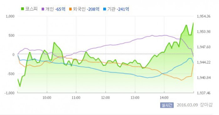 9일 코스피지수는 전일 대비 0.35%(6.83포인트) 오른 1952.95에 장을 마쳤다. 코스닥지수는 전날 보다 0.79%(5.32포인트) 상승한 679.64에 마감했다.
