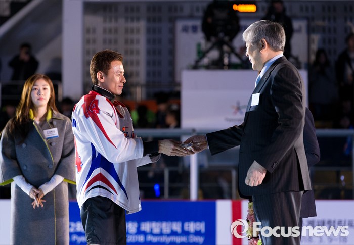 (춘천=포커스뉴스) 9일 오후 강원 춘천의암빙상장에서 열린 제2회 2018 평창 패럴림픽 데이에서 패럴림픽 홍보대사로 위촉된 아이스슬레지하키 선수 정승환(왼쪽 두번째)이 조양호 평창동계올림픽 조직위원장으로부터 위촉패를 전달 받고 있다.