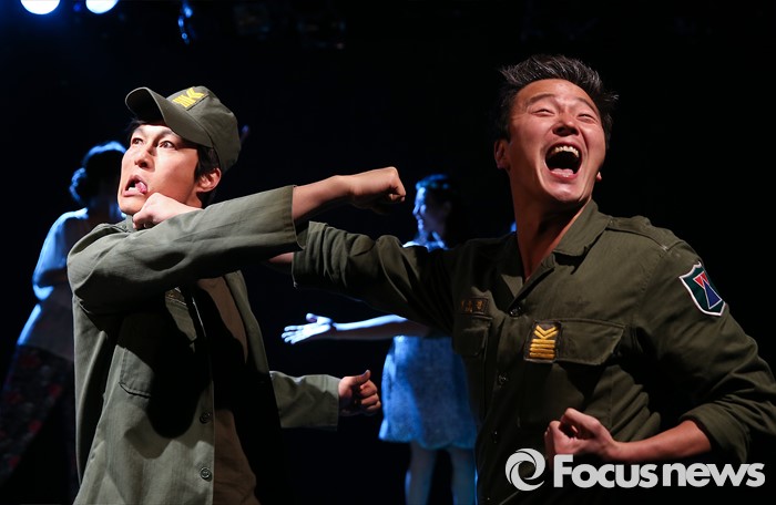 (서울=포커스뉴스) 9일 오후 서울 종로구 선돌극장에서 열린 연극 '백중사 이야기' 프레스콜 행사에 참석한 배우 조운(오른쪽)이 주요 장면을 시연하고 있다.