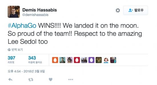 한편 알파고는 구글이 소유한 딥마인드가 개발한 인공지능 프로그램으로 이날 세계 최강의 이세돌 9단과의 공식 대국에서 승리했다. 사람이 만든 인공지능 시스템이 프로 바둑 기사를 능가하는 실력을 갖추게 됐음을 입증한 셈이다.데미스 하사비스 구글 딥마인드 CEO 트위터 <사진출처=트위터>