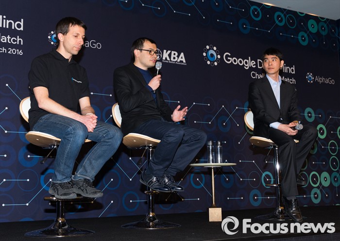 (서울=포커스뉴스) 바둑기사 이세돌(오른쪽) 9단과 데미스 하사비스(가운데) 구글 딥마인드 최고경영자가 9일 오후 서울 중구 포시즌스호텔에서 구글 딥마인드 챌린지 매치, 인공지능 바둑프로그램 알파고와의 첫번째 대국 후 기자회견을 하고 있다.