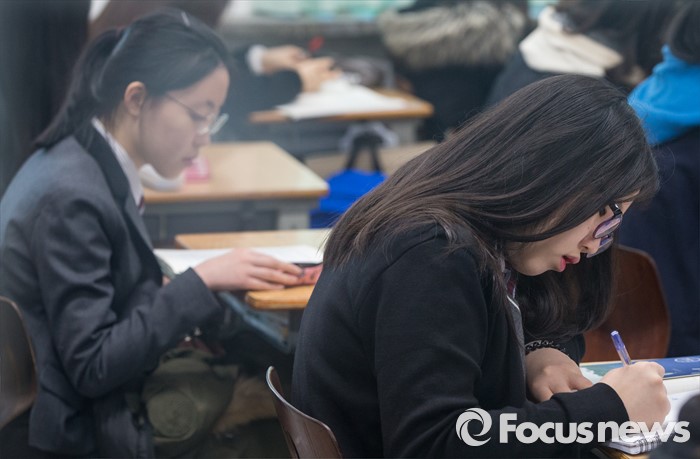 (서울=포커스뉴스) 10일 오전 서울 서대문구 명지고등학교에서 1학년 학생들이 2016학년도 첫 전국연합학력평가를 앞두고 마지막 공부를 하고 있다.