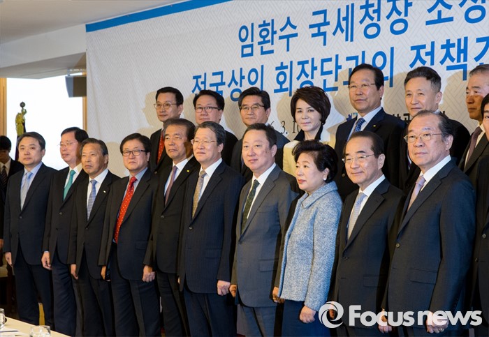 (서울=포커스뉴스) 10일 오전 서울 중구 대한상공회의소에서 열린 국세청장 초청 전국상의 회장단 정책간담회에 참석한 임환수 국세청장(앞줄 왼쪽 여섯번째부터), 박용만 대한상의 회장, 현정은 현대그룹 회장을 비롯한 상의 회장단이 기념촬영을 하고 있다.