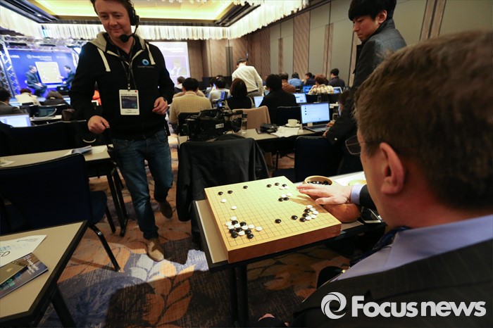 (서울=포커스뉴스) 10일 오후 서울 종로구 포시즌스호텔 기자실에서 한 외신 기자가 이세돌 9단과 구글 인공지능 알파고의 '구글 딥마인드 챌린지 매치' 2차 대국을 보며 직접 바둑을 두고 있다.