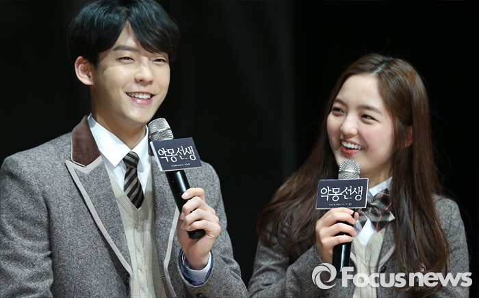 (서울=포커스뉴스) 10일 오후 서울 강남구 일지아트홀에서 열린 웹드라마 '악몽선생' 제작발표회에 참석한 배우 이민혁(왼쪽)과 서신애가 미소를 짓고 있다.