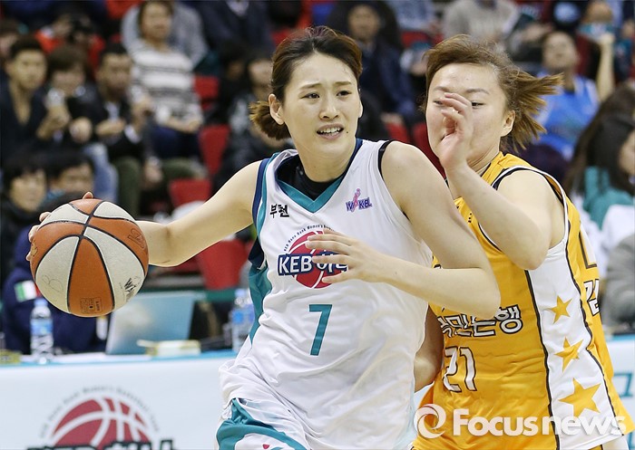 (부천=포커스뉴스) 10일 부천체육관에서 열린 2015-2016 여자프로농구 PO 1차전 KEB하나-KB스타즈 경기에서 KEB하나 강이슬이 KB스타즈 김진영의 마크를 제치며 골밑으로 대시하고 있다.