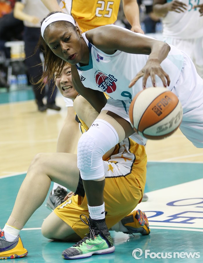 (부천=포커스뉴스) 10일 부천체육관에서 열린 2015-2016 여자프로농구 PO 1차전 KEB하나-KB스타즈 경기에서 KEB하나 버니스 모스비가 KB스타즈 김진영과의 리바운드 다툼에서 볼을 잡아내고 있다.