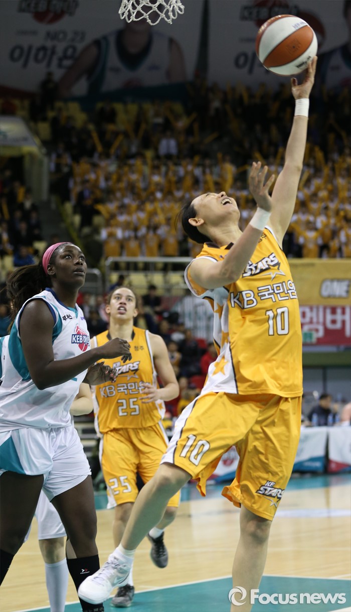 (부천=포커스뉴스) 10일 부천체육관에서 열린 2015-2016 여자프로농구 PO 1차전 KEB하나-KB스타즈 경기에서 KB스타즈 변연하가 KEB하나 첼시 리의 마크를 제치고 리버스 레이업슛을 쏘고 있다.