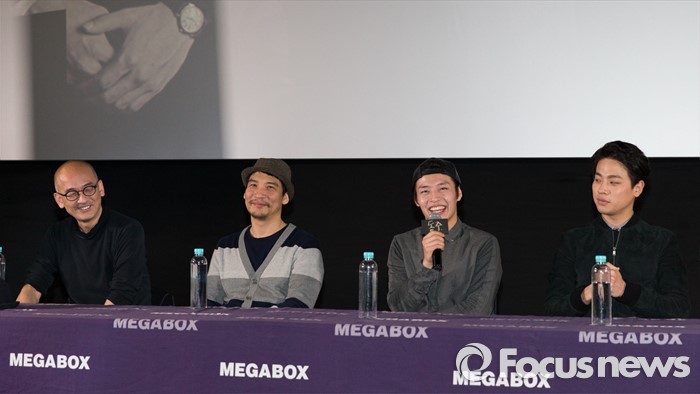 (서울=포커스뉴스) 10일 오후 서울 강남구 코엑스 메가박스에서 열린 영화 '동주'의 관객과의 대화에 참석한 배우 강하늘이 관객들의 질문에 답변하고 있다. 왼쪽부터 이준익 감독, 모그 음악감독, 배우 강하늘, 박정민.